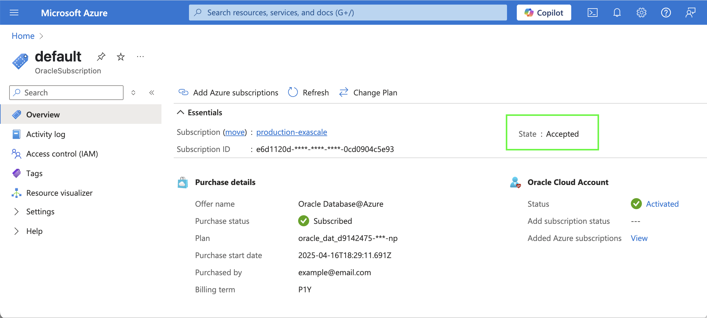 Select default to view the details page for the Oracle Database@Azure offer that you subscribed to during service onboarding.