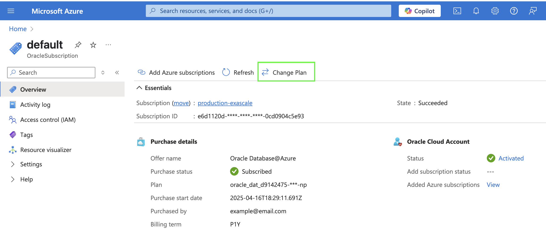 If you need to change your Oracle Database@Azure purchase plan, start by contacting Oracle Sales and requesting a new private offer. After you receive and accept the new private offer, follow the steps in this topic to update your plan details in Azure. Common scenarios for changing a purchase plan include expiration of an existing private offer or transitioning from a public offer to a private offer.